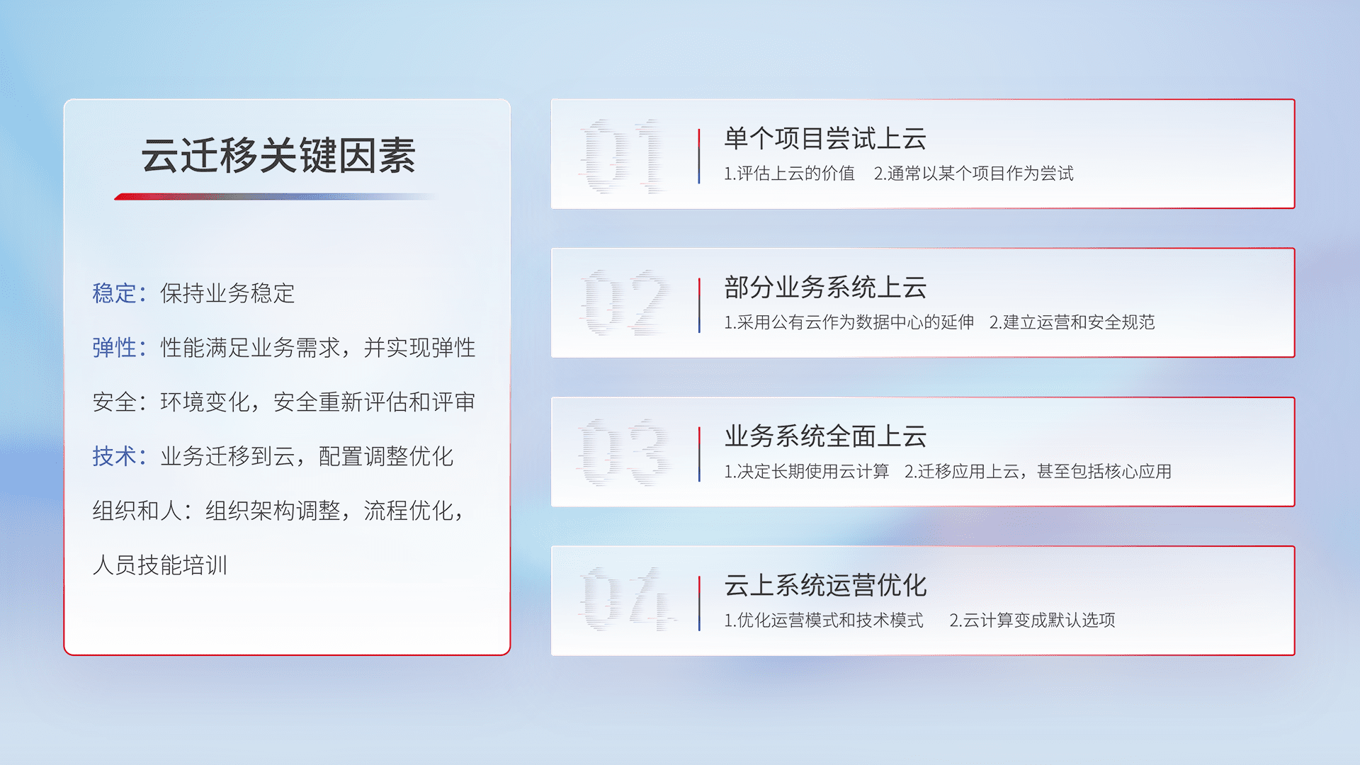 结合实际业务,,从规划设计、、云平台选型、、、云原生改造、、数据迁移、、、集成交付,,,,迁移全过程为客户识别最佳上云路径,,做好风险识别管理,,设计网络架构、、、、身份权限、、、安全审计合规、、操作审计、、、日志审计、、监控告警策略、、、多站点容灾设计等,,,对云上基础设施进行整体规划,,,提升IT治理水平,,,以满足弹性、、、高可用、、高性能的需求。。。